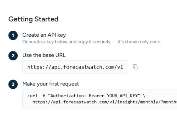 Stop waiting for manual provisioning. In most SaaS platforms, getting API access is an enterprise hurdle. With ForecastWatch, it’s a click away. Access is included with most accounts, allowing you to generate a key and make your first request in minutes. Build, test, and deploy without the typical “integration lag.”