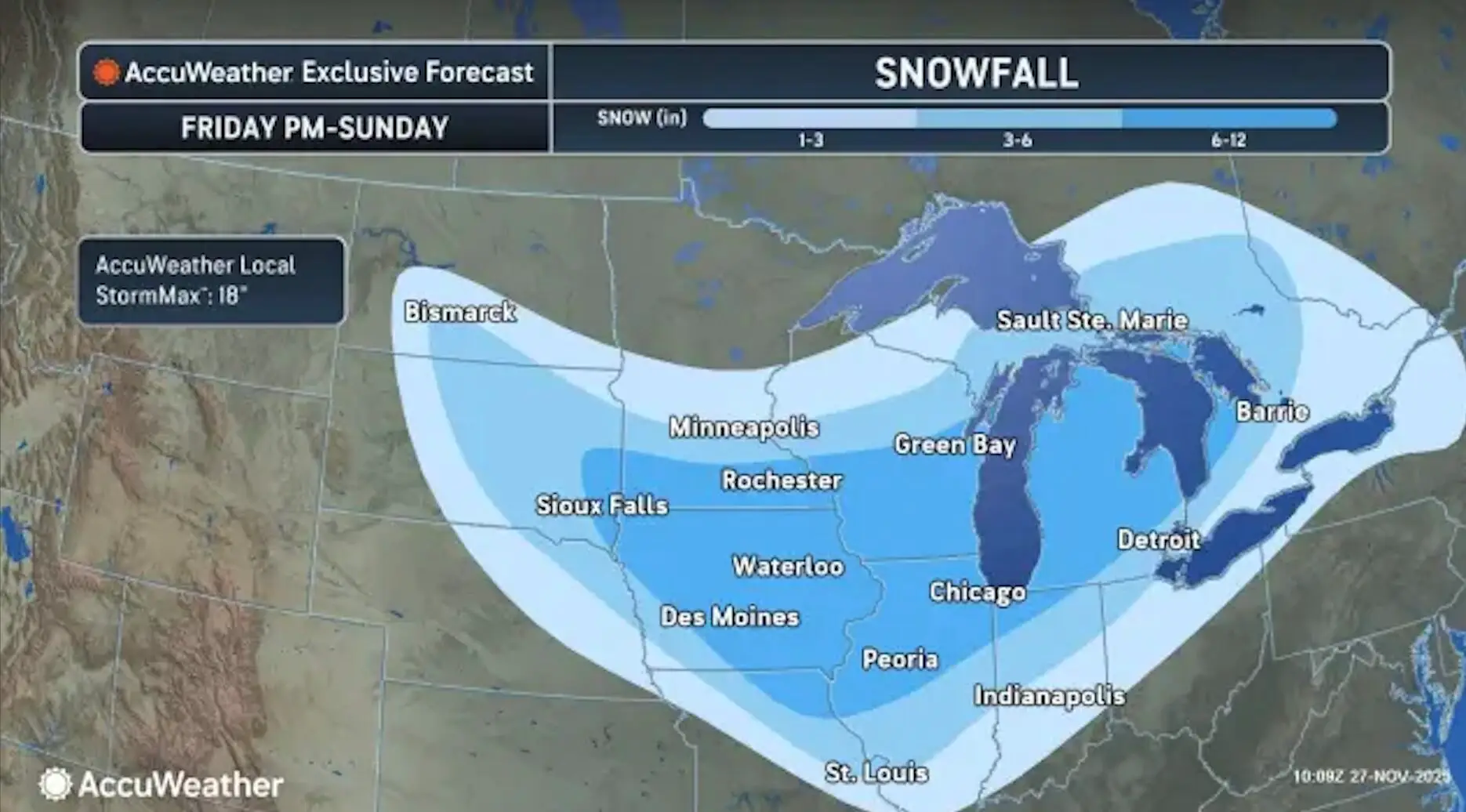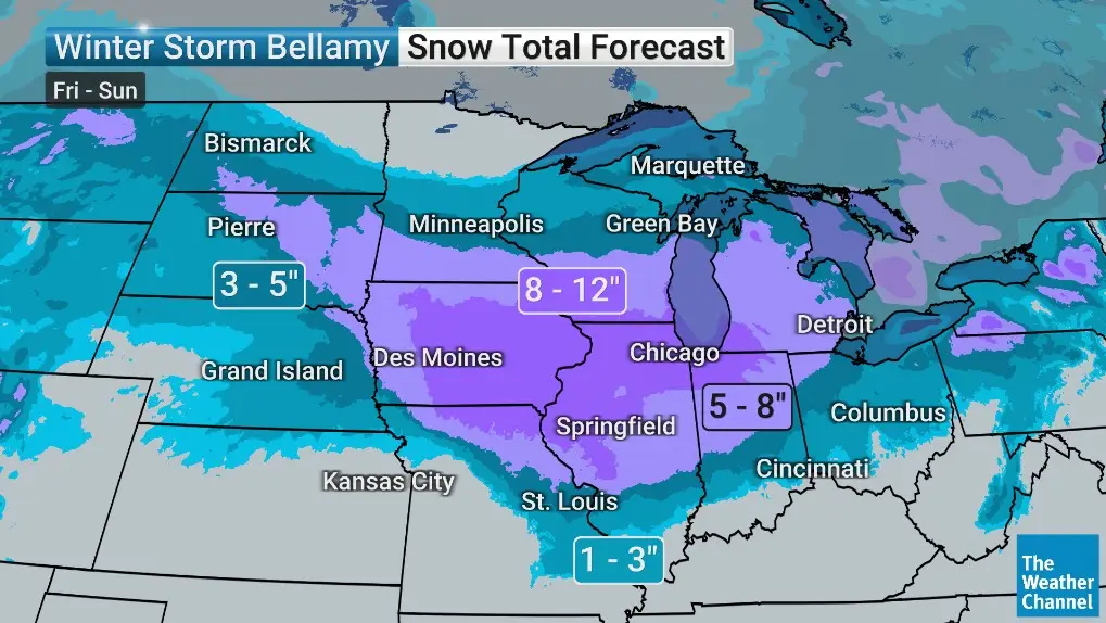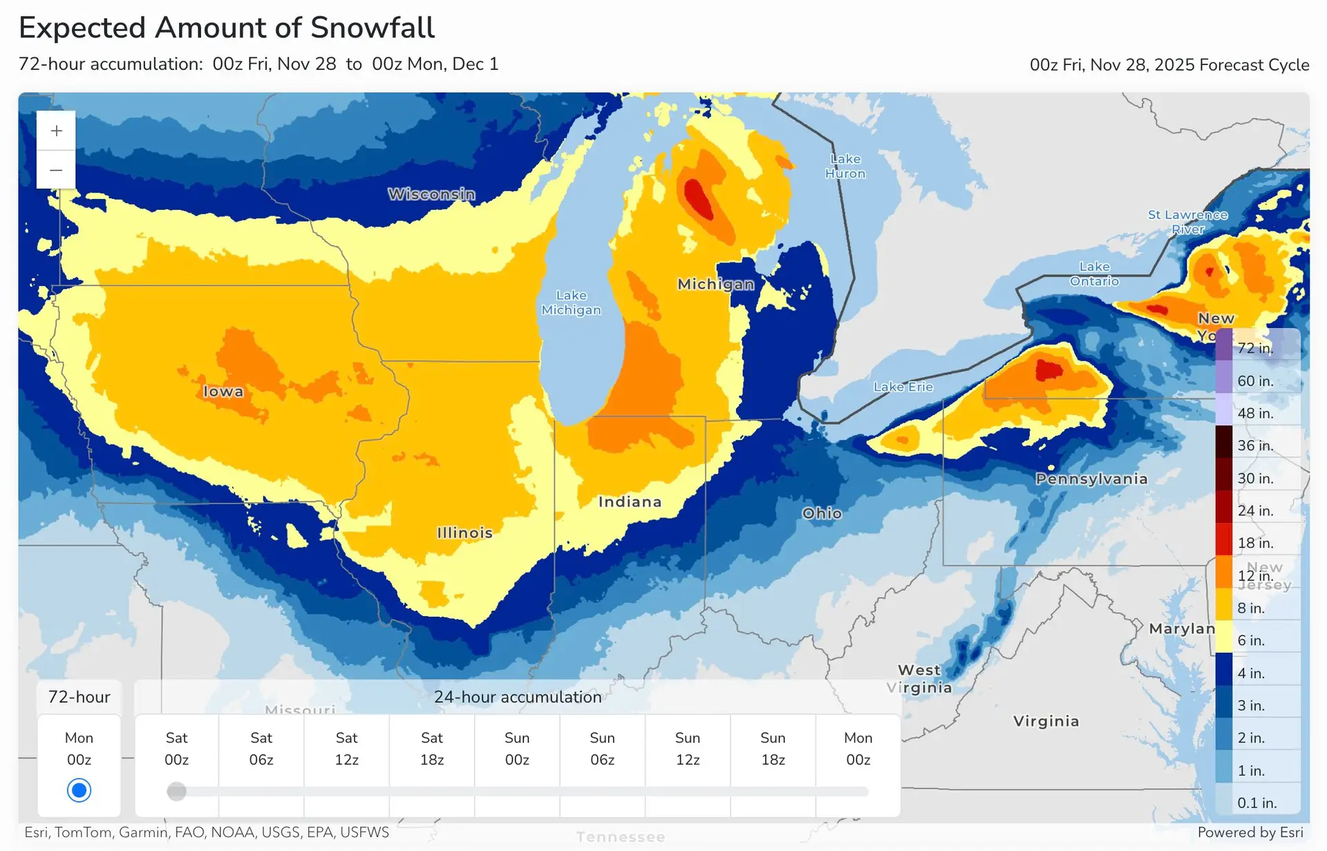 AccuWeather predicted a wider range of snow totals in the heart of the Midwest with 6-12″ of snow from far eastern South Dakota through Michigan, and less than 6″ for surrounding areas. The U.S. National Weather Service (NWS) predicted higher totals in some areas, with 12-18″ forecasted in central Iowa and the Indiana/Michigan border, as well as other lake-effect snow-prone areas. A few areas of 18-24″ snowfall areas are highlighted in prominent lake-effect snow areas.