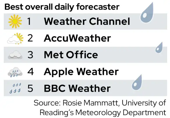 The best overall daily forecaster was The Weather Channel. AccuWeather was second overall, followed by the Met Office, then Apple Weather, and finally with BBC Weather in last place again.