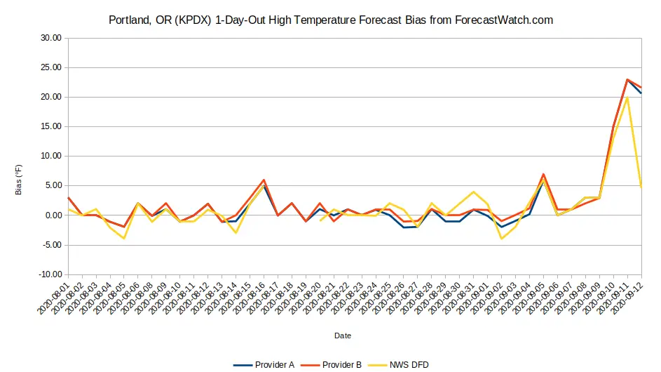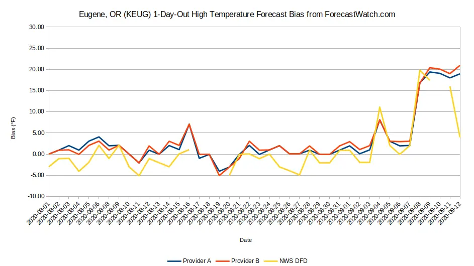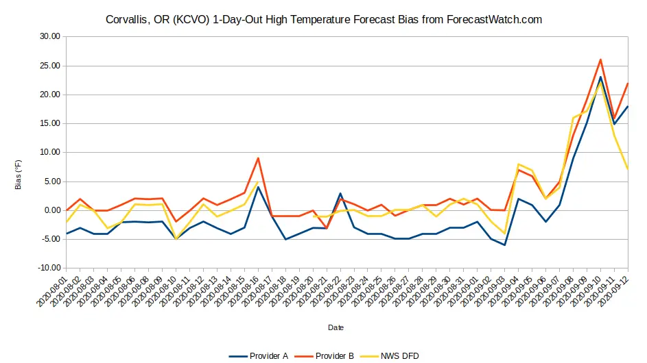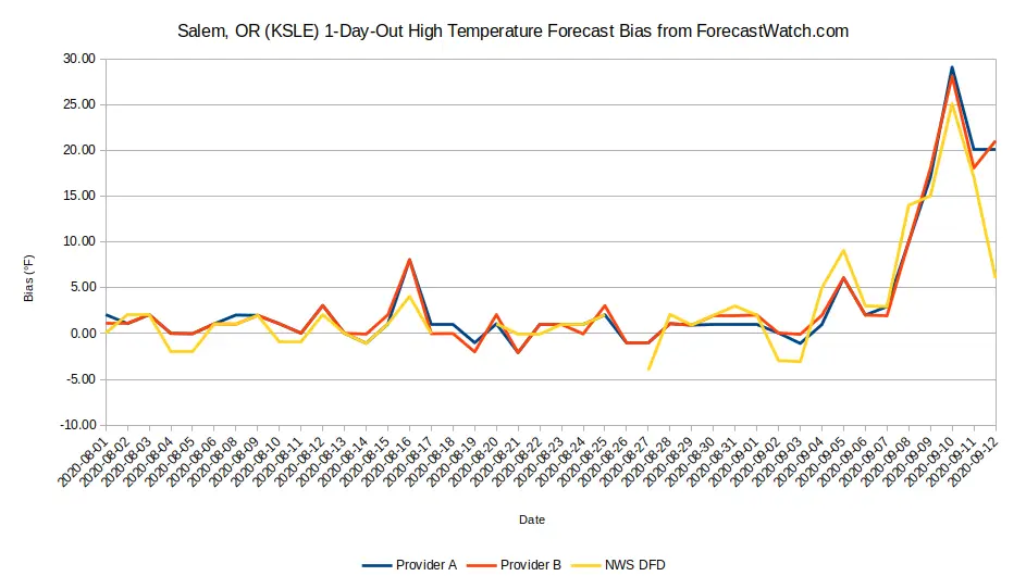 1. There is some evidence suggesting that the NWS, unlike other weather forecast providers, begin factoring in the smoke layer beginning on September 12. This caused the difference in forecast accuracy between the NWS and commercial weather forecast providers to be unusually high.